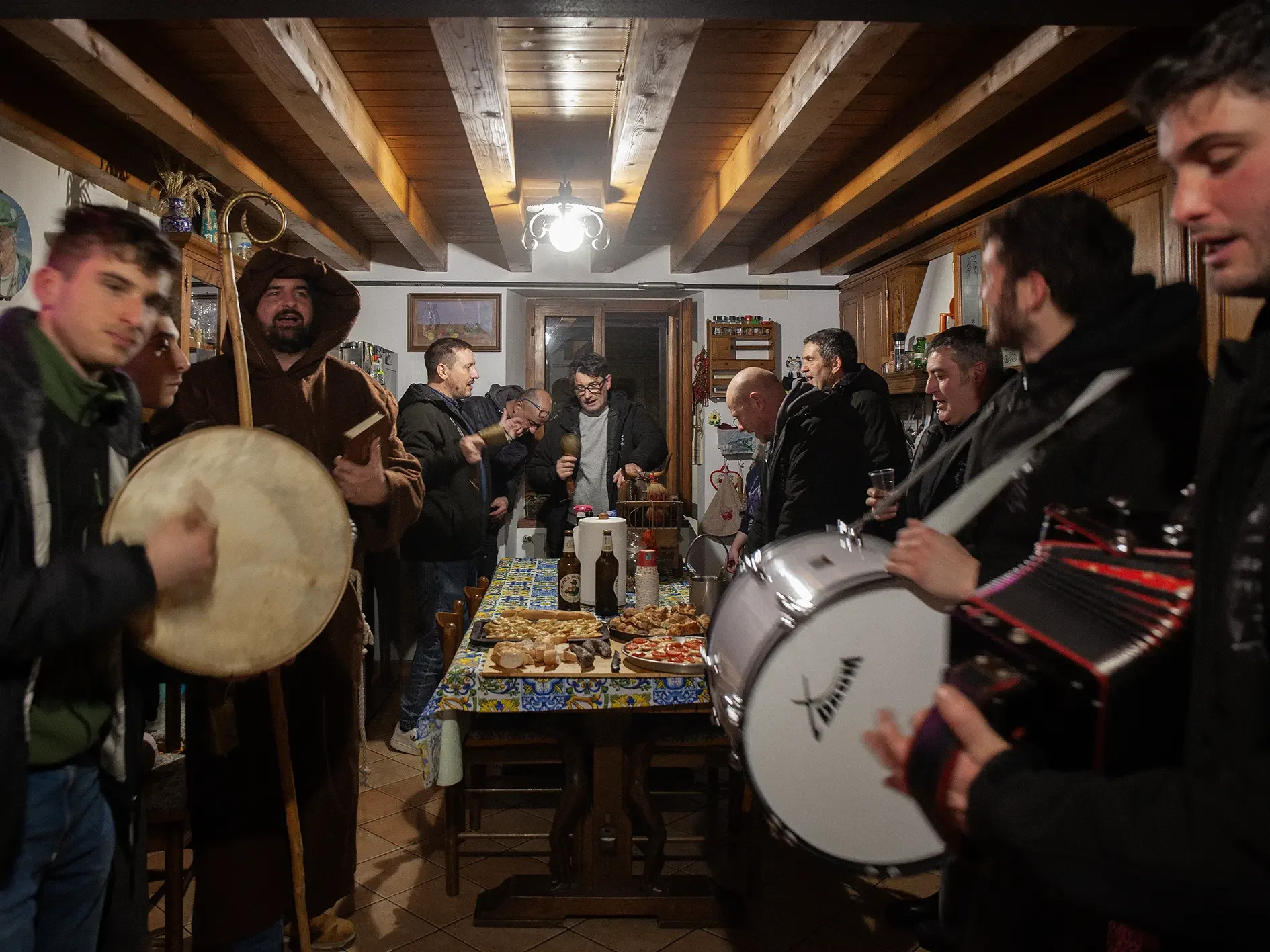 Il mio progetto sul decennale del terremoto ieri sera mi ha portato ancora una volta a Spelonga, piccola frazione di Arquata del Tronto, dove un folto e allegro gruppo di spelongani, guidati da “Sant’Antonio”, girano per le vie del paese con fisarmoniche, tamburelli, tamburi e campanacci. Poi, come da tradizione, visitano le abitazioni private, cantando, ballando e suonando canti popolari in onore di Sant’Antonio Abate. Questo rito viene ripetuto decine di volte per quante sono le case che visitano ed ogni volta vengono lautamente ricompensati con dell’ottimo cibo e del buonissimo vino . Il “pellegrinaggio” si protrae fino a tarda notte. Viva le tradizioni!